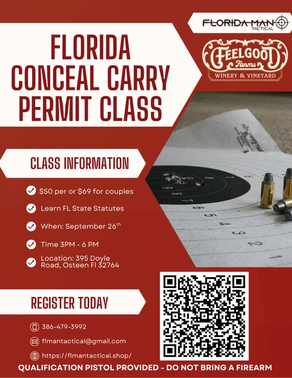 Florida Concealed Carry Permit class will be held at on September 26TH from 3-6pm at Feelgood Farms 395 Doyle Rd, Osteen, FL 32764